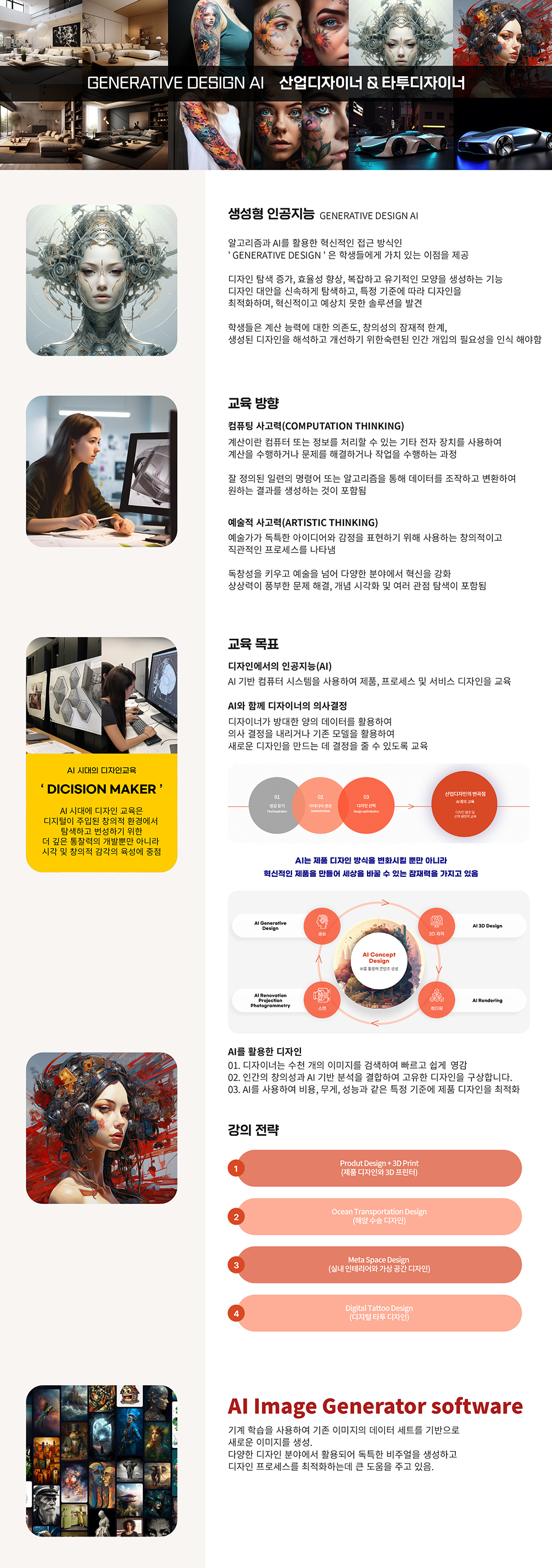 국내 유일 타투디자인 전문 교육과정을 개설/운영하고 있습니다. 또한, 우수한 타투이스트 강사진을 통한 체계적인 교육과 노하우 습득으로 세계적인 타투디자이너 양성을 목표로 한다.